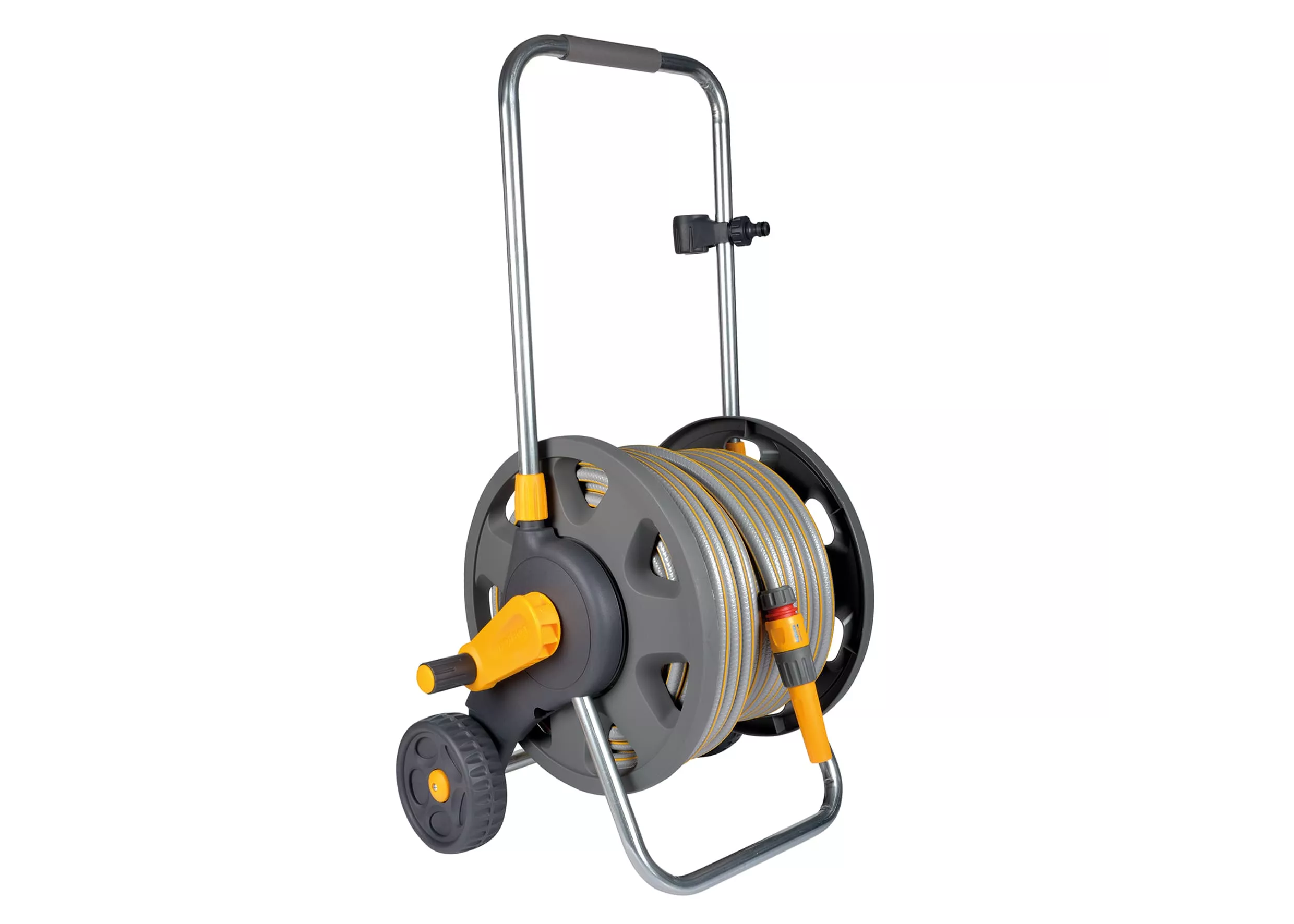Wolno stojący wózek na wąż na kółkach z regulowaną rączką do łatwego przemieszczania po ogrodzie. Zestaw zawiera wąż i wyposażenie – wszystko, czego potrzebujesz, aby rozpocząć podlewanie.